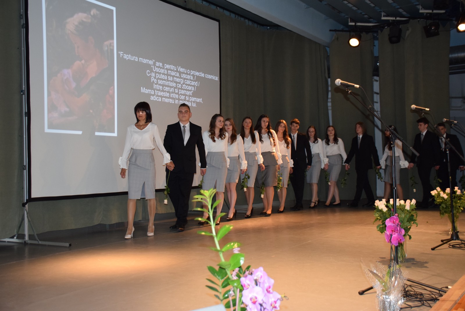 Festivitatea a continuat cu un program literar-artistic pregătit cu migală de absolvenţi, câteva melodii şi versuri în limba română şi maghiară, dar fiecare clasă a inclus şi câteva momente dedicate celei mai dragi fiinţe, mama.