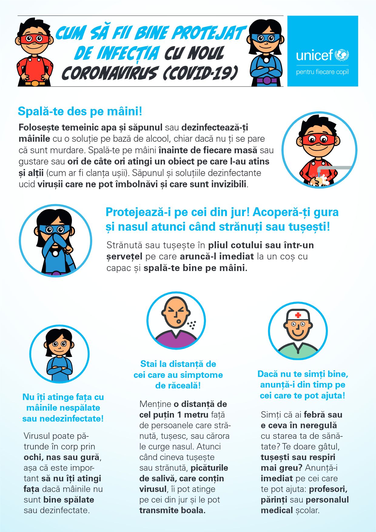Școlile ar trebui să ofere copiilor informații vitale referitoare la spălatul mâinilor și alte măsuri prin care se pot proteja pe ei și familiile lor, să faciliteze acordarea de sprijin în domeniul sănătății mintale și să ajute la prevenirea stigmatizării și a discriminării, încurajând elevii să se comporte frumos unii cu alții și să evite stereotipurile când vorbesc despre virus.
