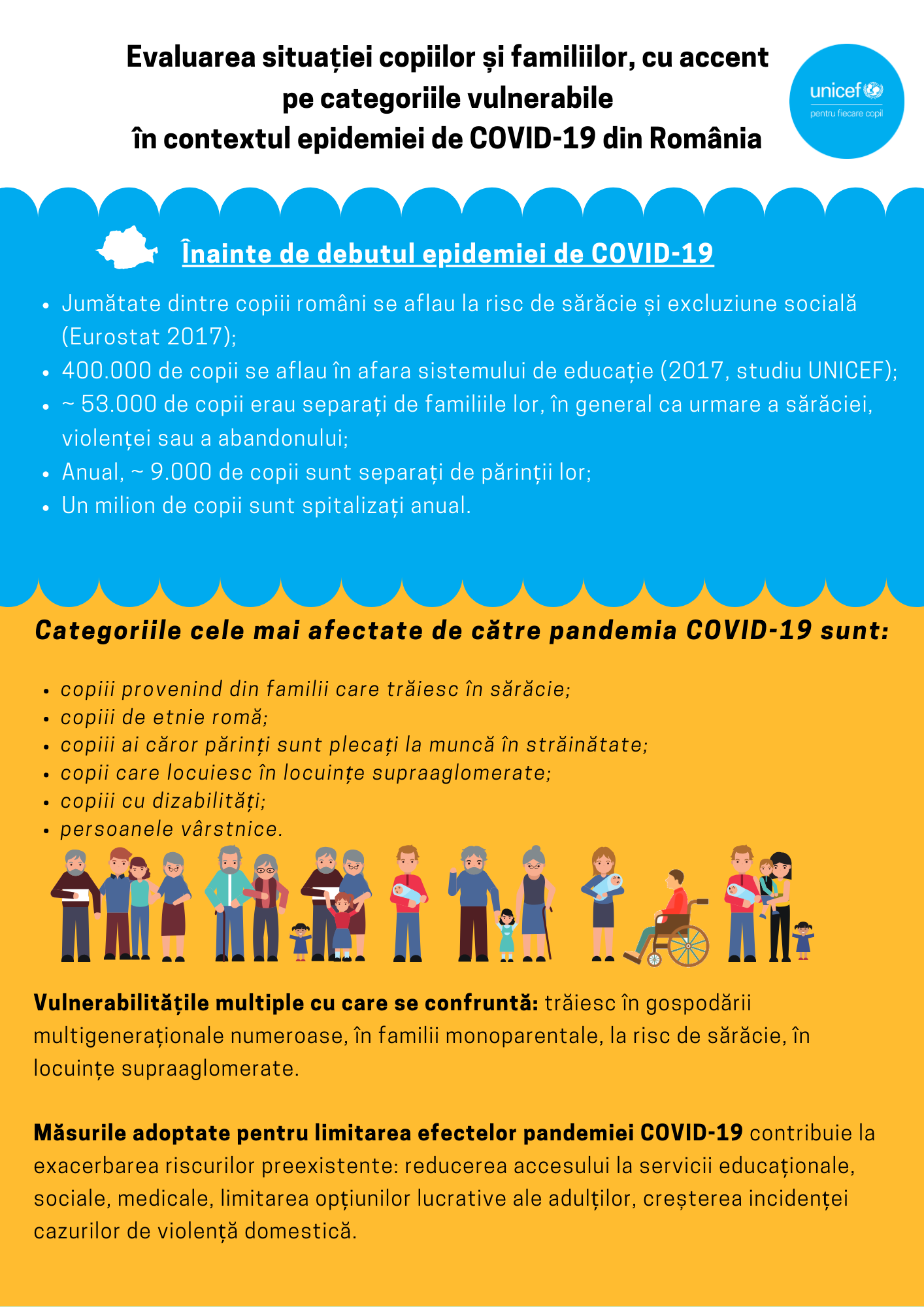 În contextul actual al pandemiei de COVID-19, vulnerabilitățile deja existente ale copiilor, familiilor și comunităților pot duce la exacerbarea riscurilor preexistente: acces limitat la servicii sociale, inegalități în ceea ce privește accesul la educație, sărăcie, se arată într-un raport coordonat de Reprezentanța UNICEF în România.