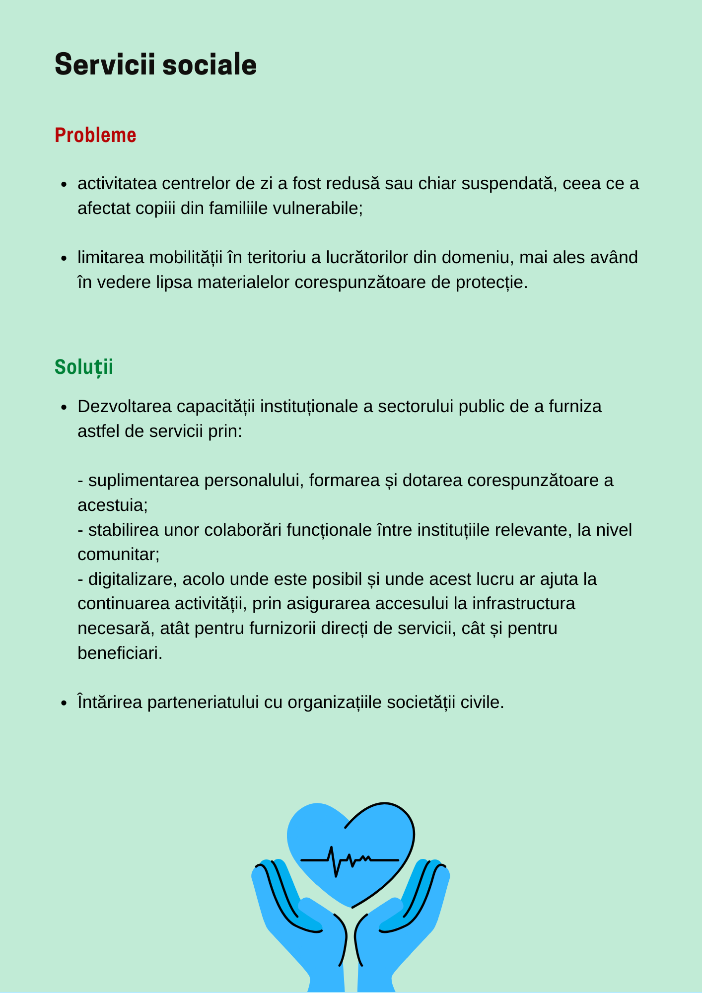 Printre problemele cu care se confruntă serviciile sociale se numără reducerea sau chiar suspendarea activității centrelor de zi și limitarea mobilității în teritoriu a lucrătorilor din domeniu, mai ales având în vedere lipsa materialelor corespunzătoare de protecție. Recomandările sunt: furnizarea de echipament corespunzător personalului existent, în special a materialelor de protecție; conceperea unor proceduri detaliate despre furnizarea de servicii sociale și de servicii de protecție specială pe timpul stării de urgență, în vederea adaptării la aceasta.