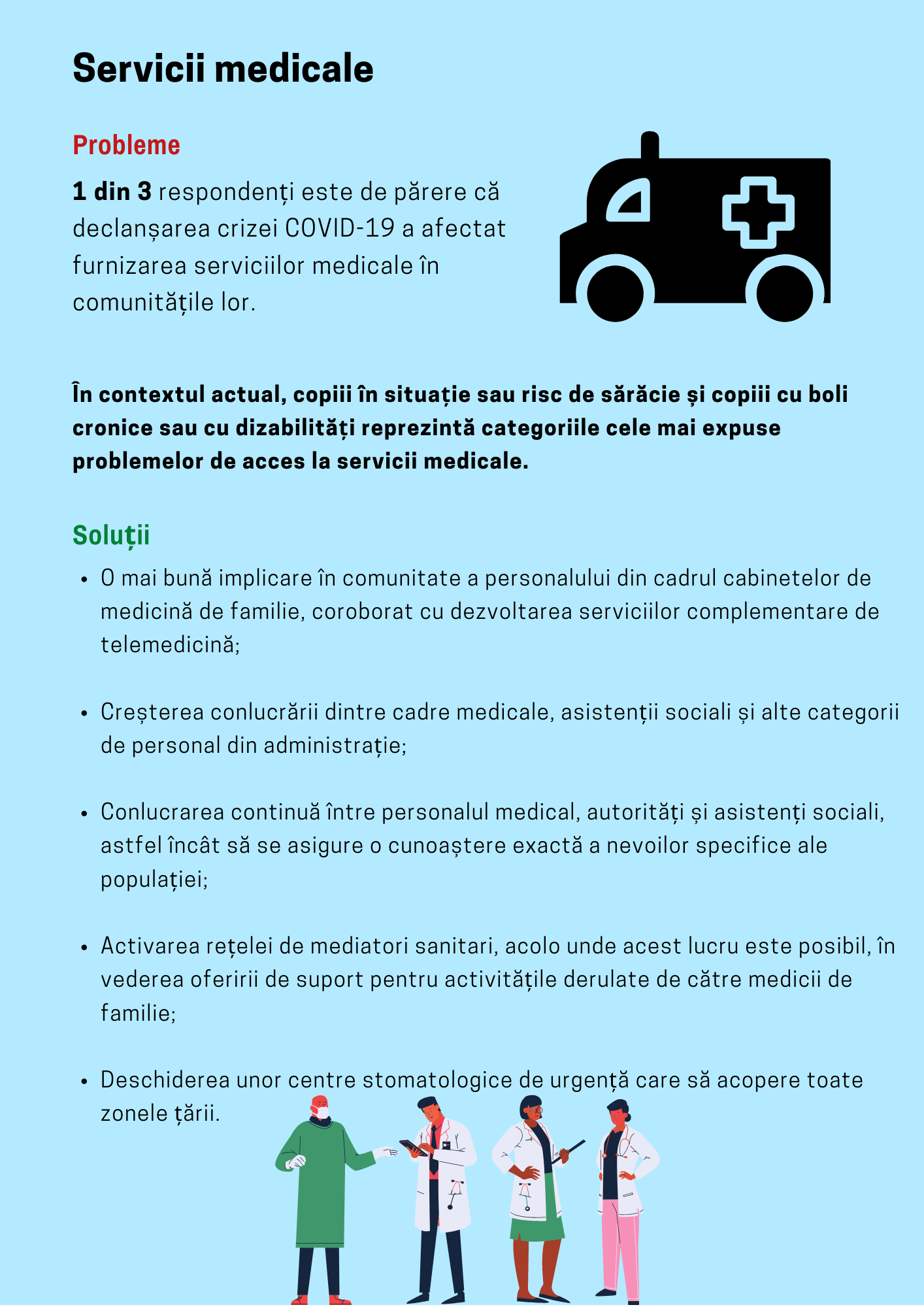 O treime dintre subiecții care au participat la studiu sunt de părere că declanșarea crizei COVID a afectat furnizarea serviciilor medicale în comunitățile lor, în special pe componenta serviciilor oferite în cadrul cabinetelor de medicină de familie. Raportul recomandă o mai bună implicare în comunitate a personalului din cadrul cabinetelor de medicină de familie, coroborat cu dezvoltarea serviciilor complementare de telemedicină; creșterea conlucrării dintre cadrele medicale, asistenții sociali și alte categorii de personal din administrație.