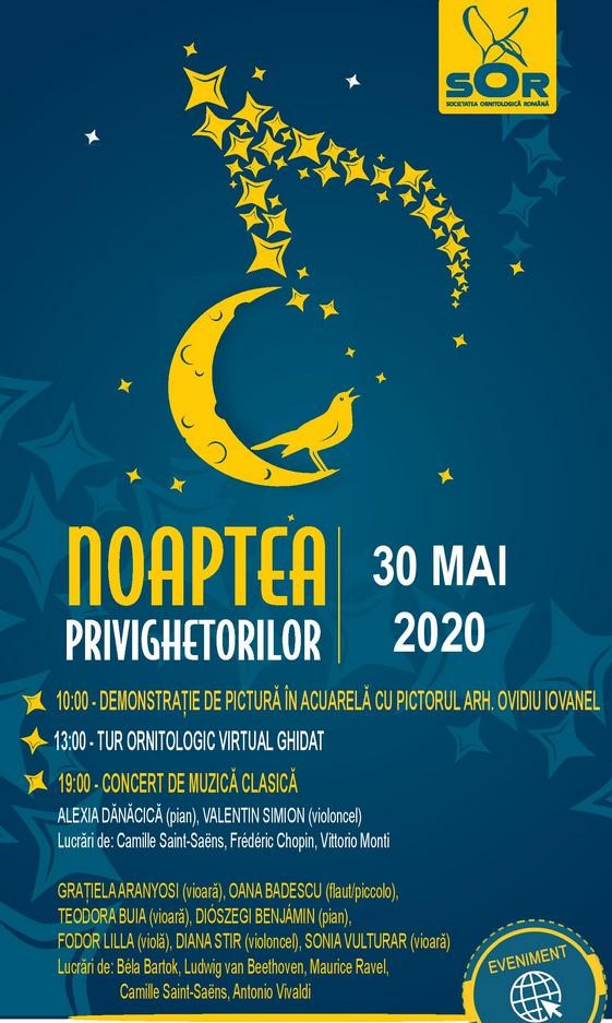 După ce vom ascula și afla informații inedite despre ele, vom încerca să le dăm replica printr-un concert de muzică clasică. Unele dintre ariile pe care le vor interpreta 9 artiști din București și din Cluj sunt opere inspirate de păsări. Evenimentul online va cuprinde și o demonstrație de pictură în acuarelă dedicată atât copiilor, cât și celor mari”, a declarat coordonatorul proiectului Noaptea Privighetorilor, Dora Domșa.