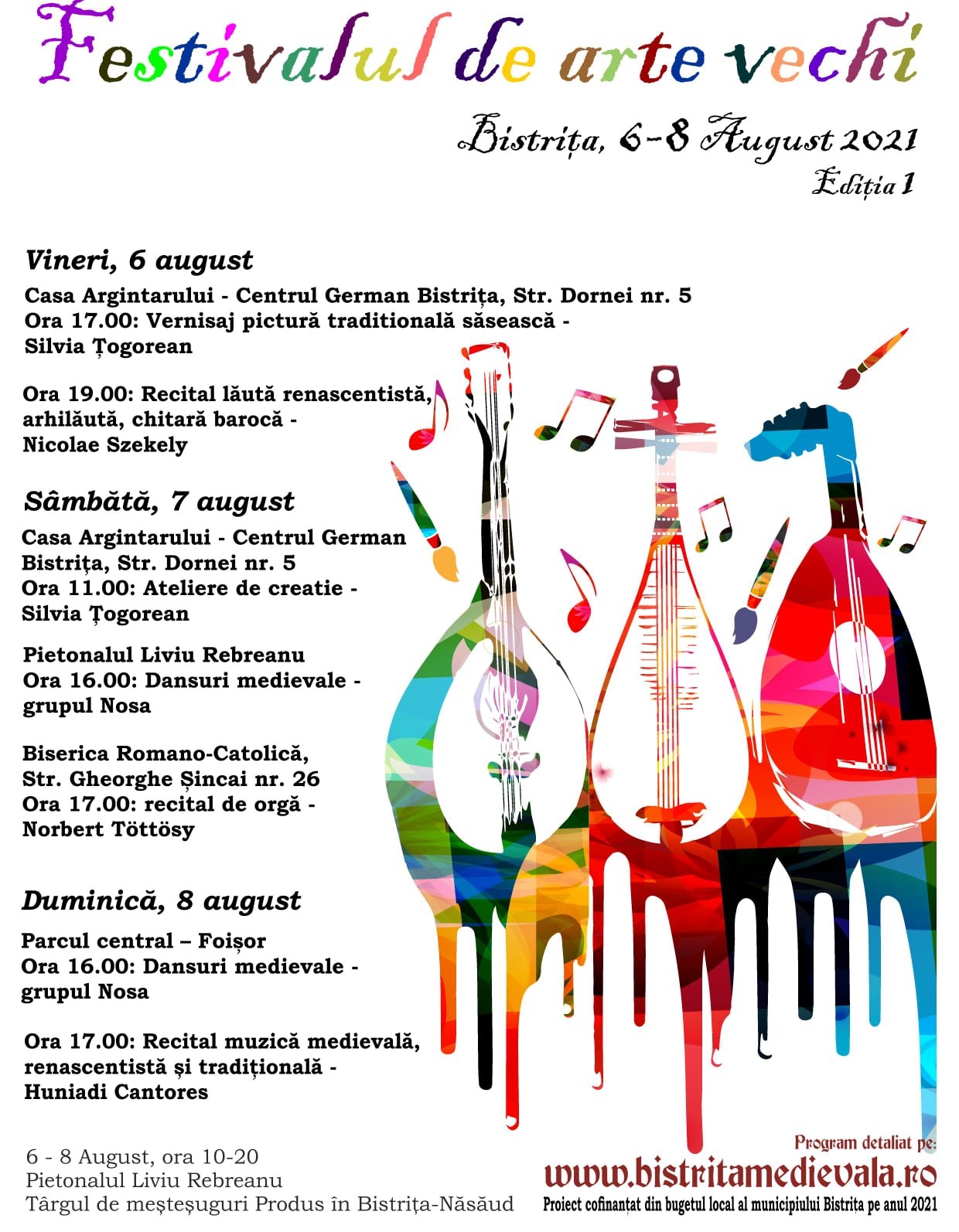 „În perioada 6-8 august, publicul larg se va putea delecta cu trei concerte de muzică veche, avându-i ca protagonişti pe Nicolae Szekely la lăuta renascentistă, archlute şi chitara barocă, Norbert Töttösy în cadrul concertului de inaugurare al sistemului pneumatic proaspăt renovat şi extins al orgii Bisericii Romano-Catolice ‘Sfânta Treime’ Bistriţa, recitalul grupului Huniai Cantores, ce va avea loc la foişorul din Parcul Municipal, iar grupul de dansuri Nosa va anima centrul vechi al Bistriţei”, se menţionează în comunicat.