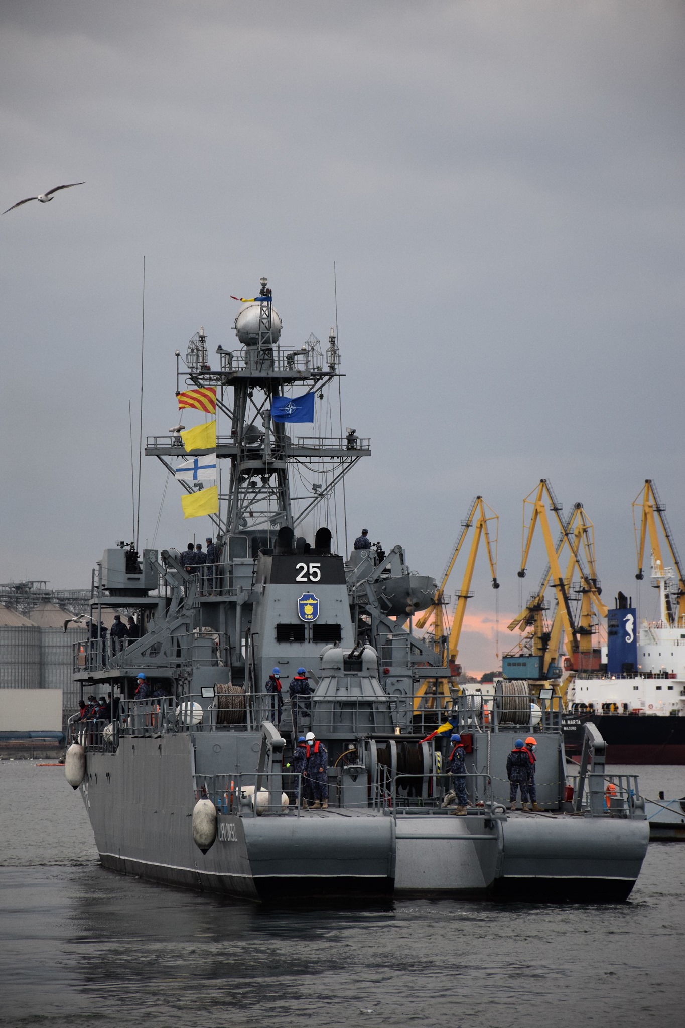 Locotenent-comandor Ionuț Diaconu: A treia integrare, anul acesta, în gruparea de luptă contra minelor, misiuni frumoase, nu ușoare, dar foarte benefice atât pentru pregătirea noastră, ca echipaj, dar și din punct de vedere al Armatei. Încă o dată dovedim că România are cu ce și poate să dovedească integrarea și parteneriatul NATO. Gruparea navală va desfășura activități specifice în Marea Neagră în perioada 23 septembrie – 14 octombrie. Misiunile specifice de luptă contra minerilor, misiuni pe care noi le-am mai făcut, pe care ne pregătim să le facem și cu care foarte ușor ne integrăm în gruparea NATO.