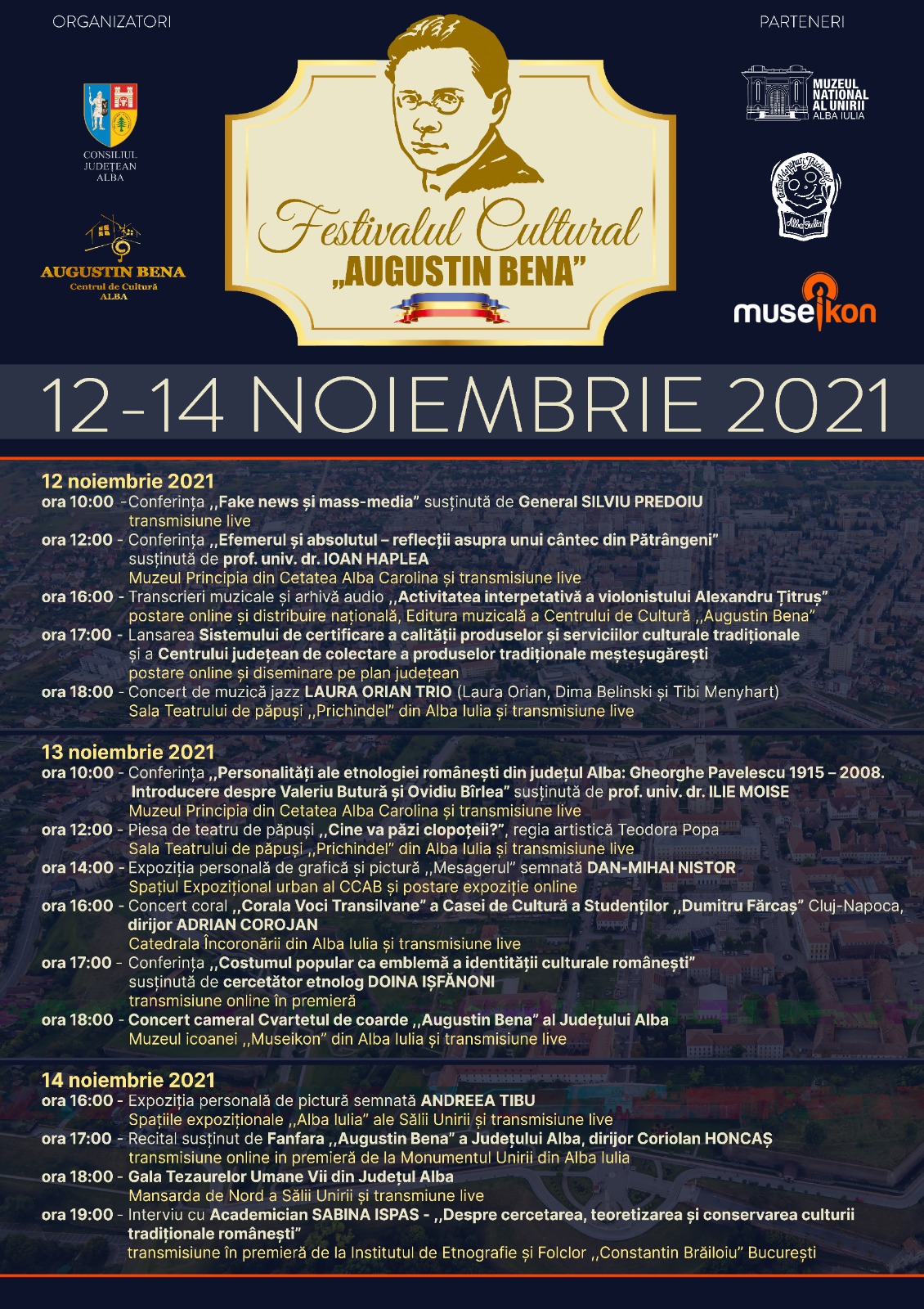 Festivalul Cultural „Augustin Bena” va avea loc la Alba Iulia, în perioada 12-14 noiembrie. În cadrul festivalului, participanții vor avea parte de recitaluri, concerte, expoziţii de artă, „Gala Tezaurelor Umane Vii din Judeţul Alba”, dar şi o conferinţă despre fake news susţinută de către fostul şef al SIE, Silviu Predoiu.