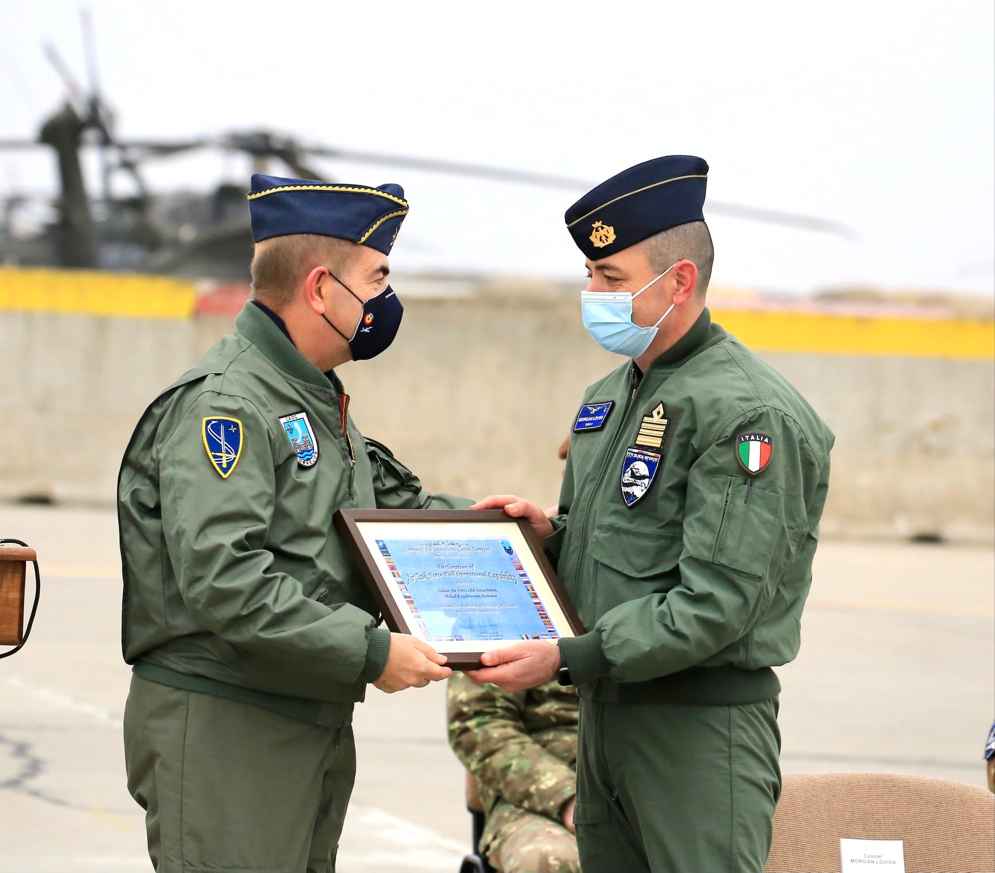 Adrian Gîtman (realizator rubrică): Misiunile de poliție aeriană întărită sub comandă NATO ale Forțelor Aeriene Române vor fi efectuate în următoarele patru luni, împreună cu aviatorii militari italienii. Detașamentul forțelor aeriene italiene formate din 140 de militari și patru aeronave Eurofighter Typhoon a fost certificat pentru această emisiune miercuri în Baza 57 Aeriană de la Mihail Kogălniceanu. Serviciul de Poliție aeriană al Alianței Nord Atlantice în zona țării noastre este coordonată de Centrul de Operații Aeriene de la Torrejón, Spania, comandat de generalul locotenent Fernando de la Cruz, prezent la ceremonia de la Mihail Kogălniceanu.