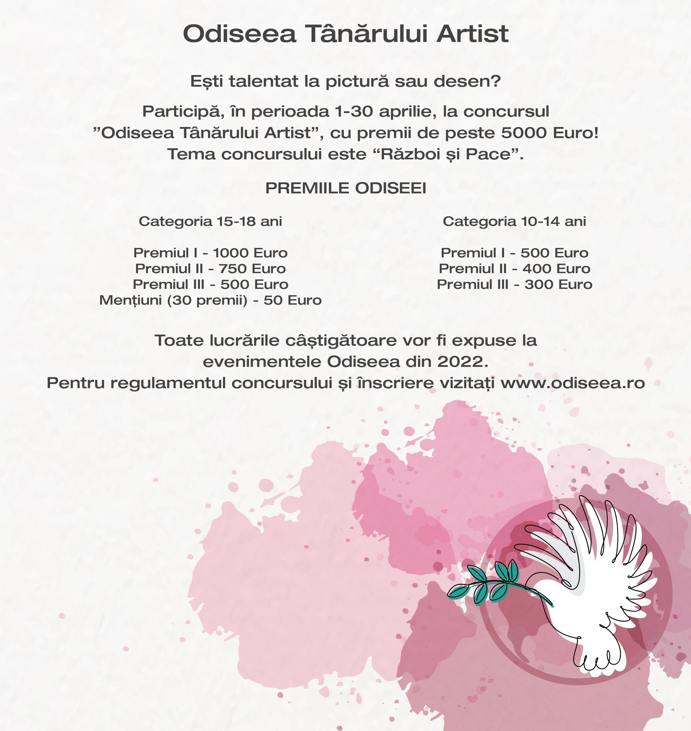 Participanții sunt invitați să realizeze o lucrare de artă (pictură, desen sau colaj) care să ilustreze tema „Război și pace” și să o înscrie online pe platforma ateliere.odiseea.ro/odiseea-tanarului-artist, în intervalul 1 aprilie – 30 aprilie.