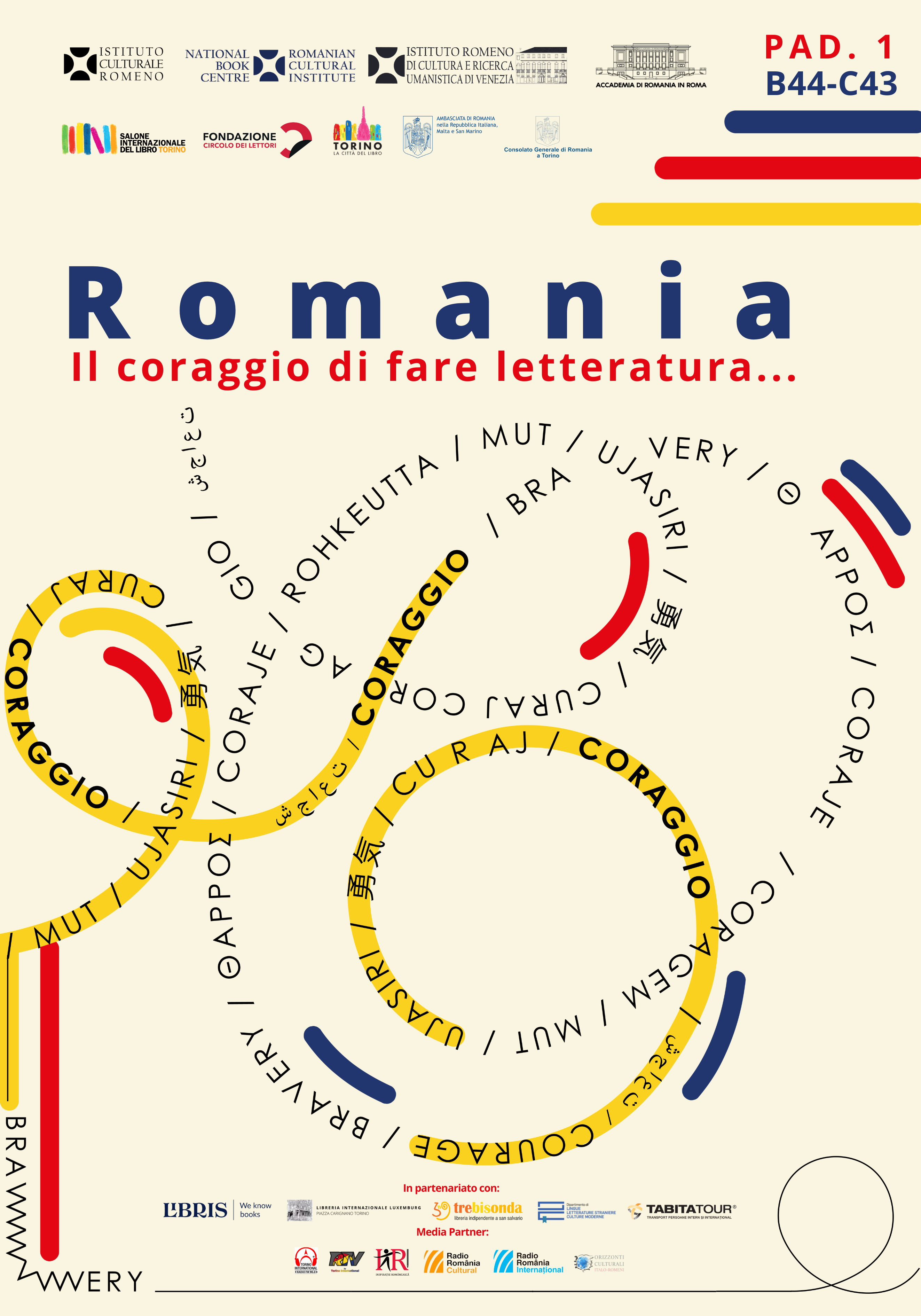 Institutul Cultural Român, prin Centrul Național al Cărții, Institutul Român de Cultură și Cercetare Umanistică de la Veneția și Accademia di Romania din Roma, organizează participarea țării noastre la cea mai importantă manifestare de profil din Italia cu un stand național intitulat Romania: Il coraggio di fare letteratura… / România: Curajul de a face literatură….