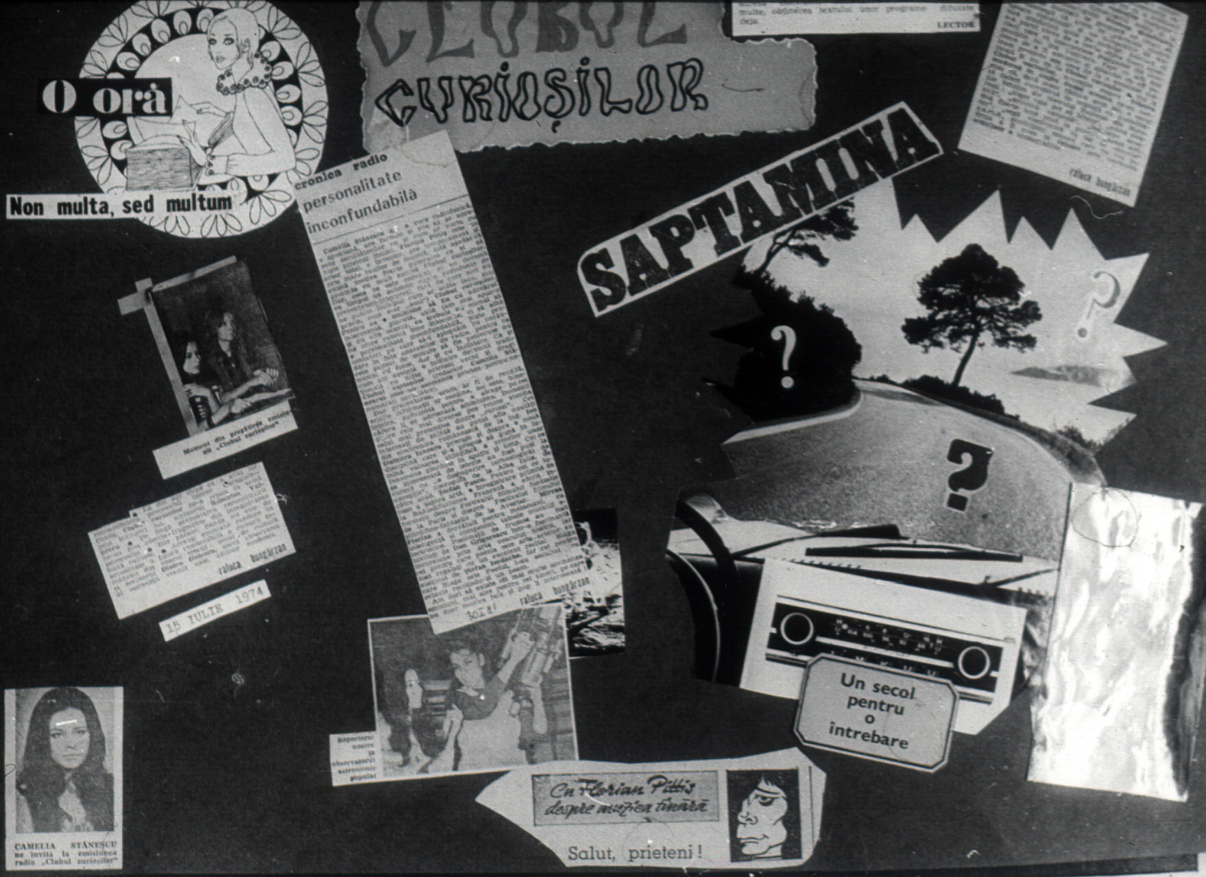 ofere rubrici bine întocmite ci să aibă o personalitate inconfundabilă, nişte prezentatori pe care să-i aşteptăm cu nerăbdare în faţa aparatelor de radio, pentru ca cele 60 de minute să fie petrecute nu numai cu folos, dar şi cu încântare. Ca şi cum am aştepta o întâlnire tradiţională cu nişte prieteni vechi şi dragi. Clubul curioşilor (redactor Camelia Stănescu) este un asemenea prieten pentru nenumăraţi ascultători. Dar prezentarea, oricât ar fi de reuşită, oricâte informaţii ar conţine, nu este, bineînţeles, suficientă pentru a atrage pe cei cărora li se adresează emisiunea. Domenii dintre cele mai diverse pot reţine atenţia celui mai pretenţios dintre curioşi. Cei interesaţi de ştiinţă au putut afla noutăţi din electronica românescă de la ing. Dumitru Ionescu, precum şi despre o nouă disciplină care şi-a propus să pună în lumină valoarea ştiinţifică a urmelor unor fenomene pierdute în spaţiu şi timp. Cei ce se interesează de istorie au fost puşi la curent cu o descoperire (arheologică) de excepţie, necropola de la Alba Iulia, de către acad. Ştefan Pascu. Pentru cei ce iubesc a şaptea artă, o înregistrare primită de la Radiodifuziunea Franceză a oferit informaţii despre Festivalul filmului fantastic de la Paris şi despre Festivalul filmului ştiinţifico-fantastic de la Avoriaz. Mircea Florian a dezvăluit pentru melomani, cu inteligenţă şi competent, tainele muzicii electronice. Pasionaţii de frumos au fost invitaţi de Dan Grigorescu într-o fascinantă incursiune prin arta veacului nostru, iar cei pentru care poezia este arta artelor au fost regalaţi cu un excelent recital Blaga susţinut de Ştefan Iordache. Cei pentru care Blaga este Poetul, l-au ascultat cu evlavie recitându-şi un poem. Am dori să existe cât mai multe asemenea emisiuni, mai ales pentru cei tineri, pe care nu doar muzicafolk şi pop îi interesează.”