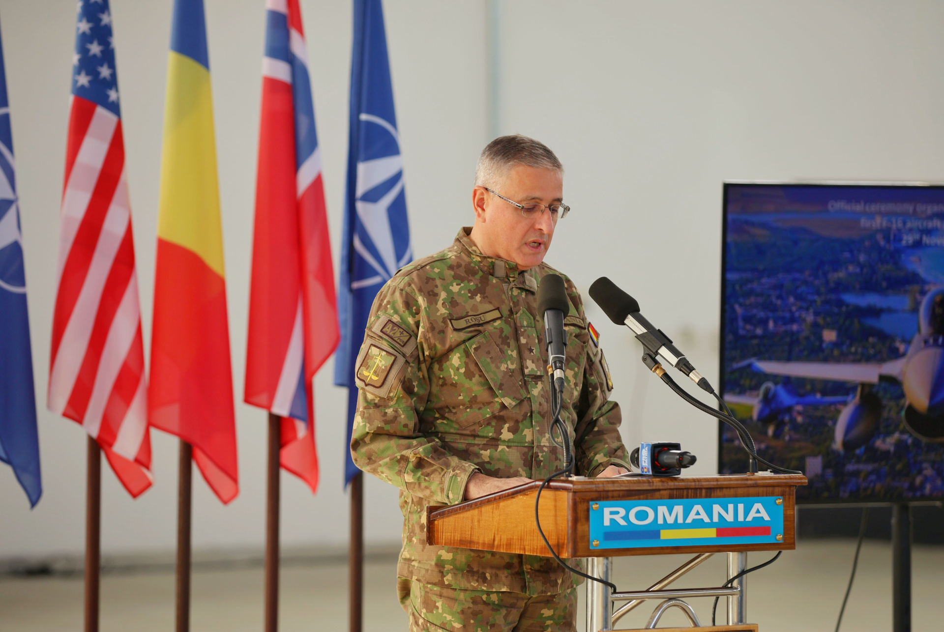 Adrian Gîtman (realizator rubrică): Primele trei aeronave F-16 din totalul de 32 achiziționate de România de la Norvegia au ajuns, miercuri, în țară. Ele au aterizat în Baza 86 Aeriană de la Borcea, unde a avut loc o ceremonie de recepție în prezența oficialilor români, norvegieni și americani.